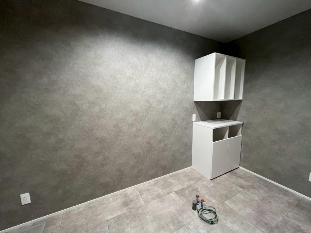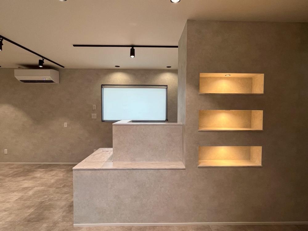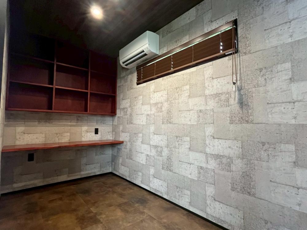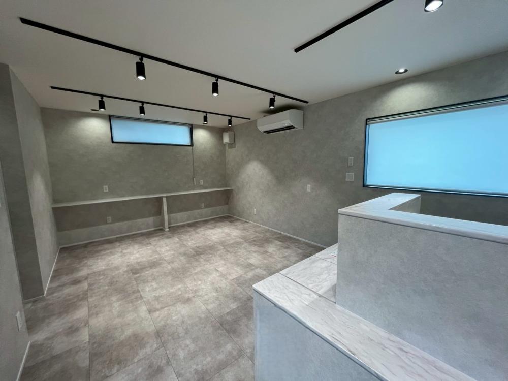 美容室はグレーを基調とした落ち着きのある空間で、お客様がゆったりと過ごせる雰囲気に。ディスプレイ棚やベンチなどの造作家具も空間に調和し、洗練された印象を演出しています。書斎には本棚とカウンターを造作し、集中できる環境を整えました。